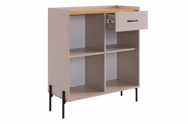 С другой стороны комод оборудован выкатным ящиком, который обеспечивает легкий доступ к часто используемым предметам. Под ним расположен большой глухой фасад, скрывающий за собой просторное хранилище для более крупных вещей.