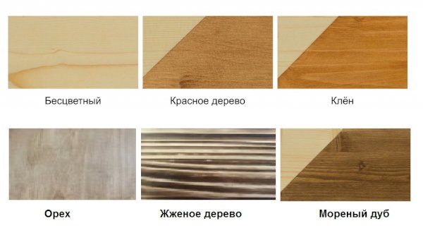 Цвета на выбор: бесцветный, клён, орех,  красное дерево, морёный дуб, жженое дерево.