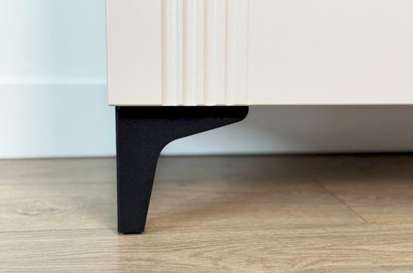Дизайн комода продуман до мелочей: с одной стороны расположена глухая дверца, за которой скрывается просторное пространство для хранения. С другой стороны – ниша с открытой полкой, выкатной ящик и ещё одна глухая дверца, что позволяет гибко организовать хранение и поддерживать порядок в доме.